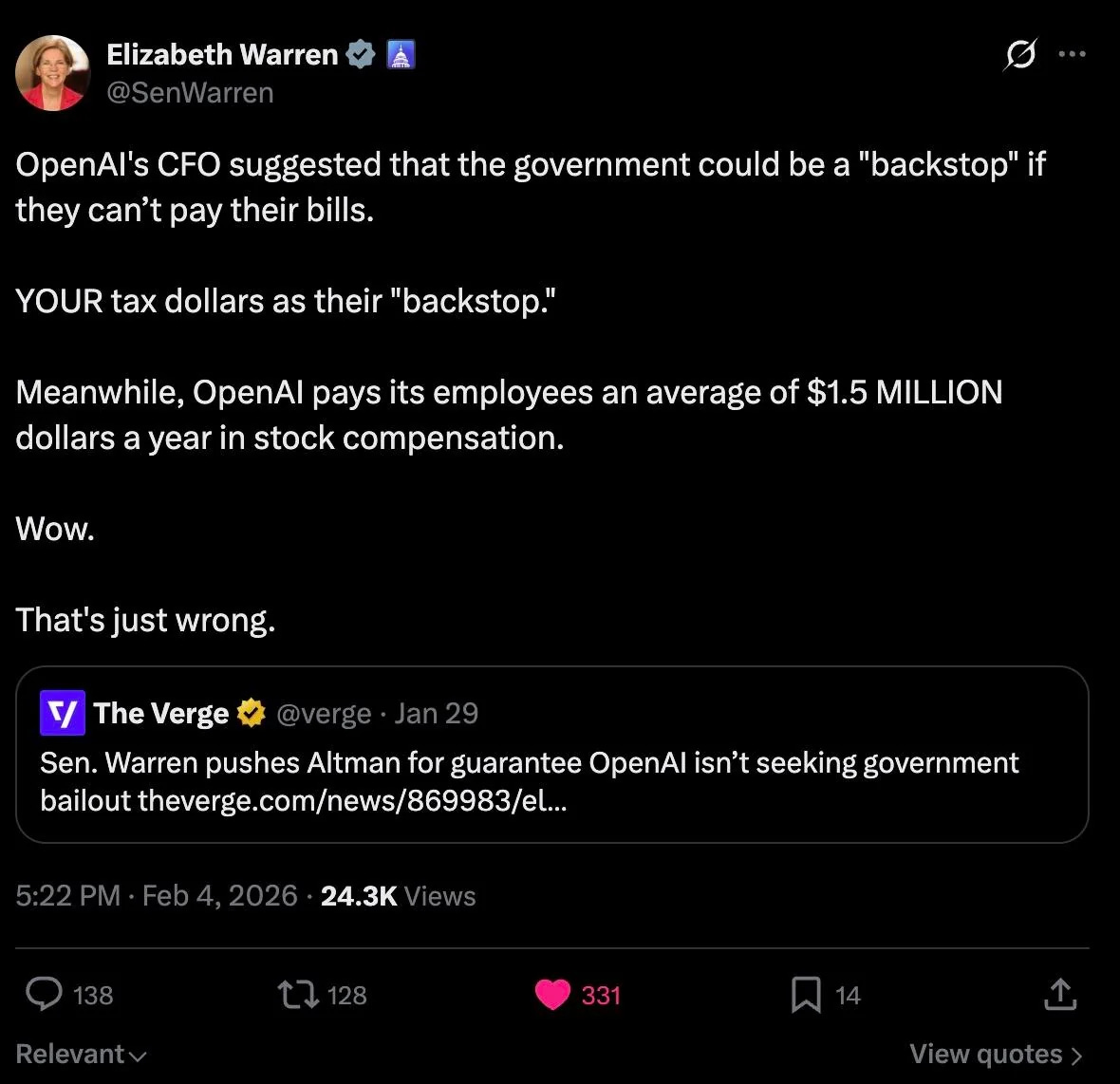 But the request had been made. And it was not an isolated incident. In March 2025, OpenAI sent a letter to the White House advocating for tax credits, loans, and other government vehicles for companies building AI infrastructure. In October, the company requested that Congress extend semiconductor tax credits to the broader AI supply chain. As Senator Elizabeth Warren documented in a January 2026 letter to Altman, the company is “privatising profits while seeking ways to let the public defray the costs of any potential failures of its business strategy.”