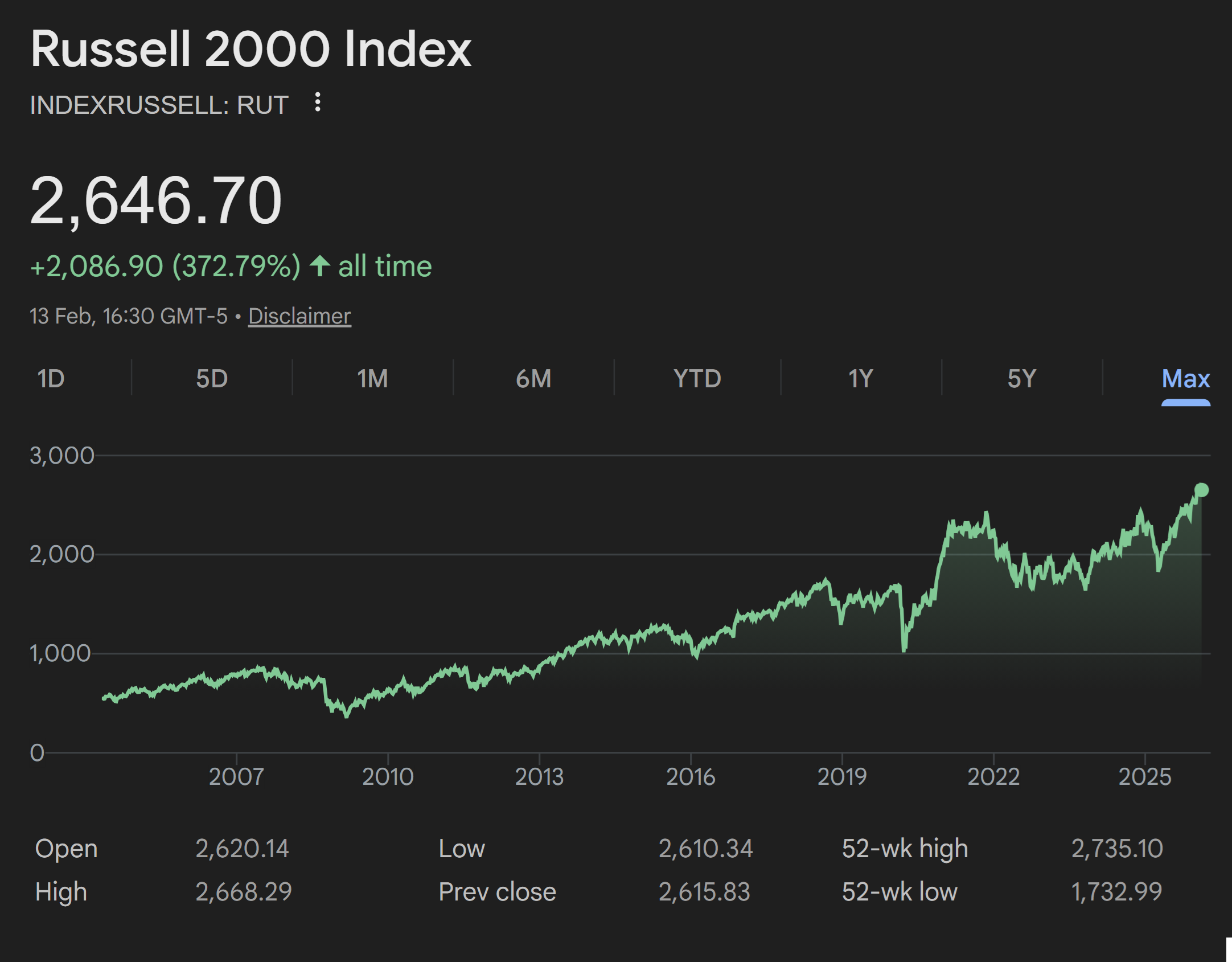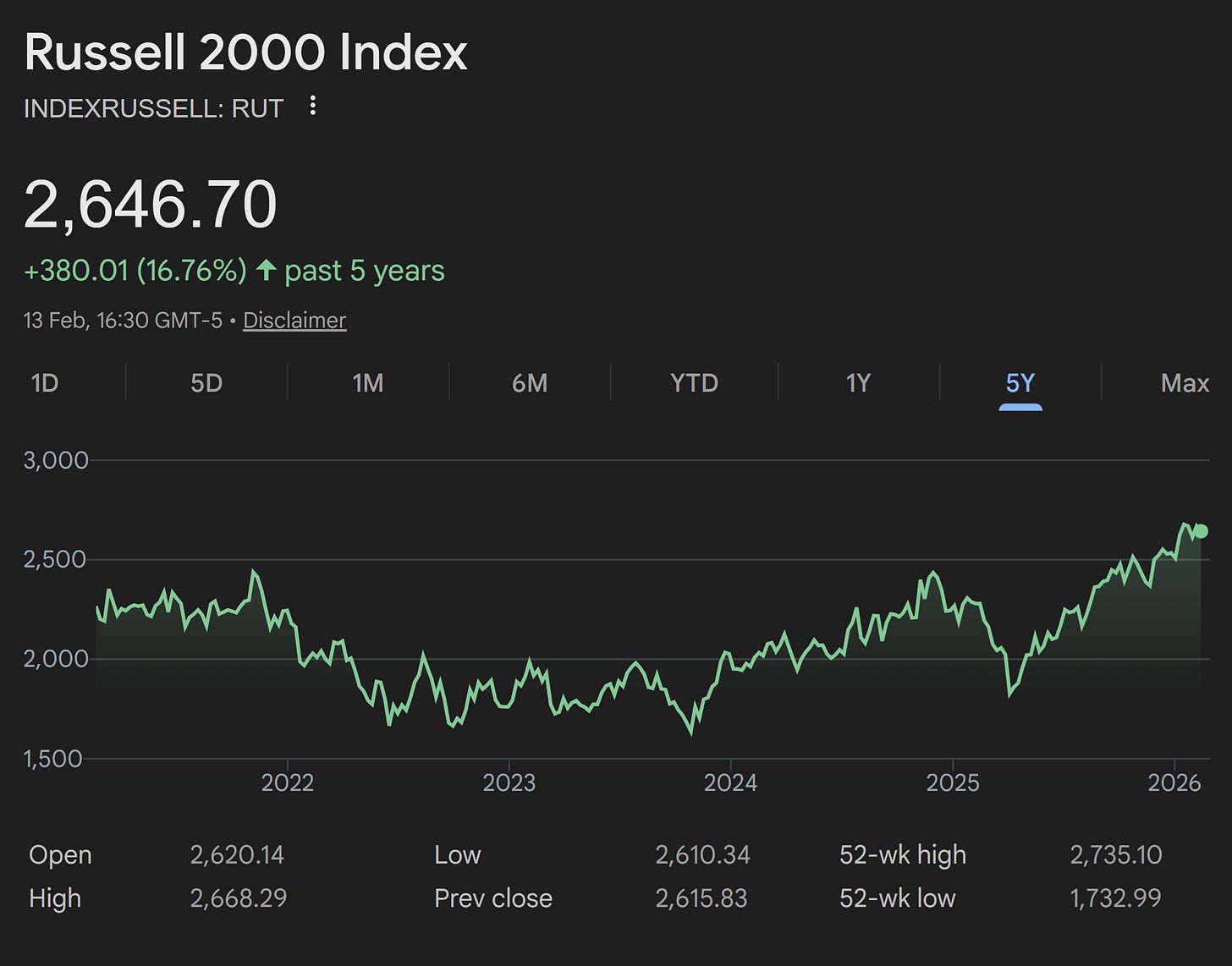 Russell 2000: +16.76% over the same 5 years (13 Feb 2026)
