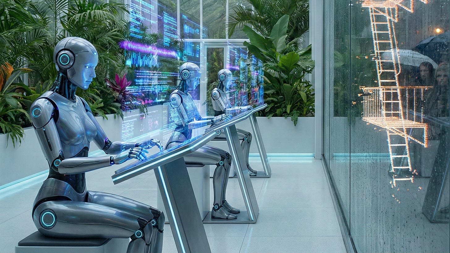 This is the central paradox: the bet is that AI will generate so much value that it justifies these valuations. But if it does, who’s left buying?