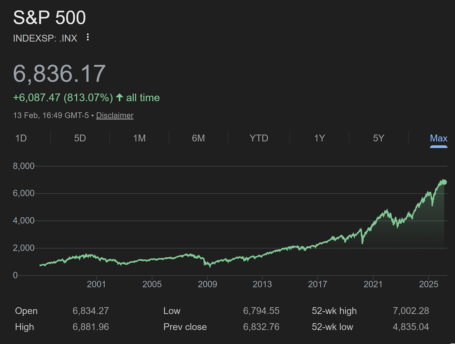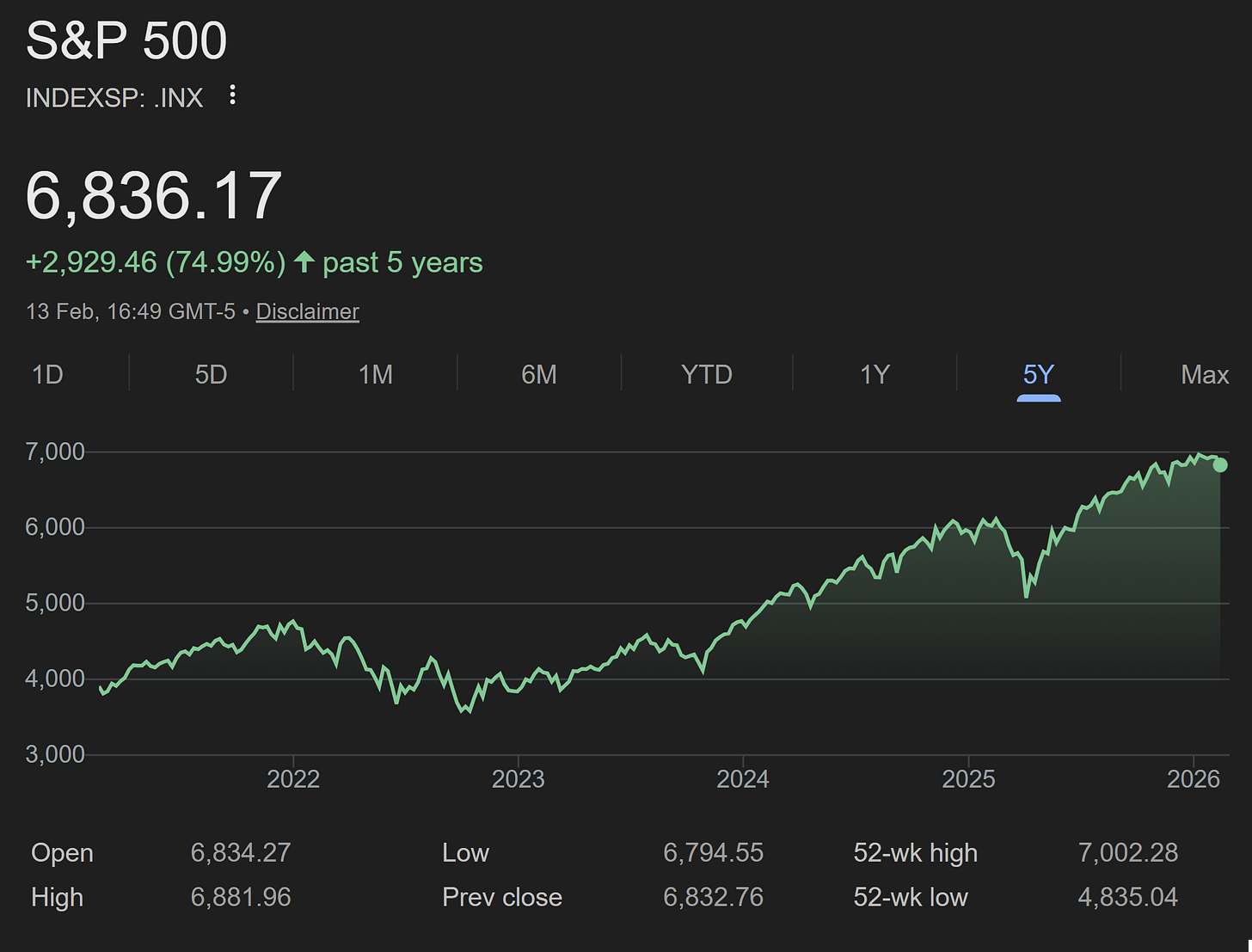 S&P 500: +74.99% over 5 years (13 Feb 2026)