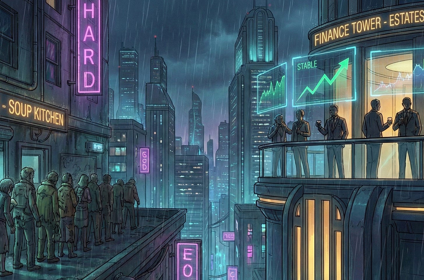 And here is the question that sits beneath all the financial analysis in this article: is a dollar the same thing to someone who needs it to eat as it is to someone who can bet it on the future of humanity and not feel the loss? The entire AI infrastructure boom—the $700 billion in annual capex, the $1.4 trillion in OpenAI commitments, the circular investments, the record debt—represents capital being deployed by people for whom the downside is a writeoff, not a catastrophe. When the bet fails, or when it succeeds in ways that eliminate jobs, the people who made the bet will be fine. They have always been fine. In 2008, the architects of the crisis received bonuses while homeowners were foreclosed on.